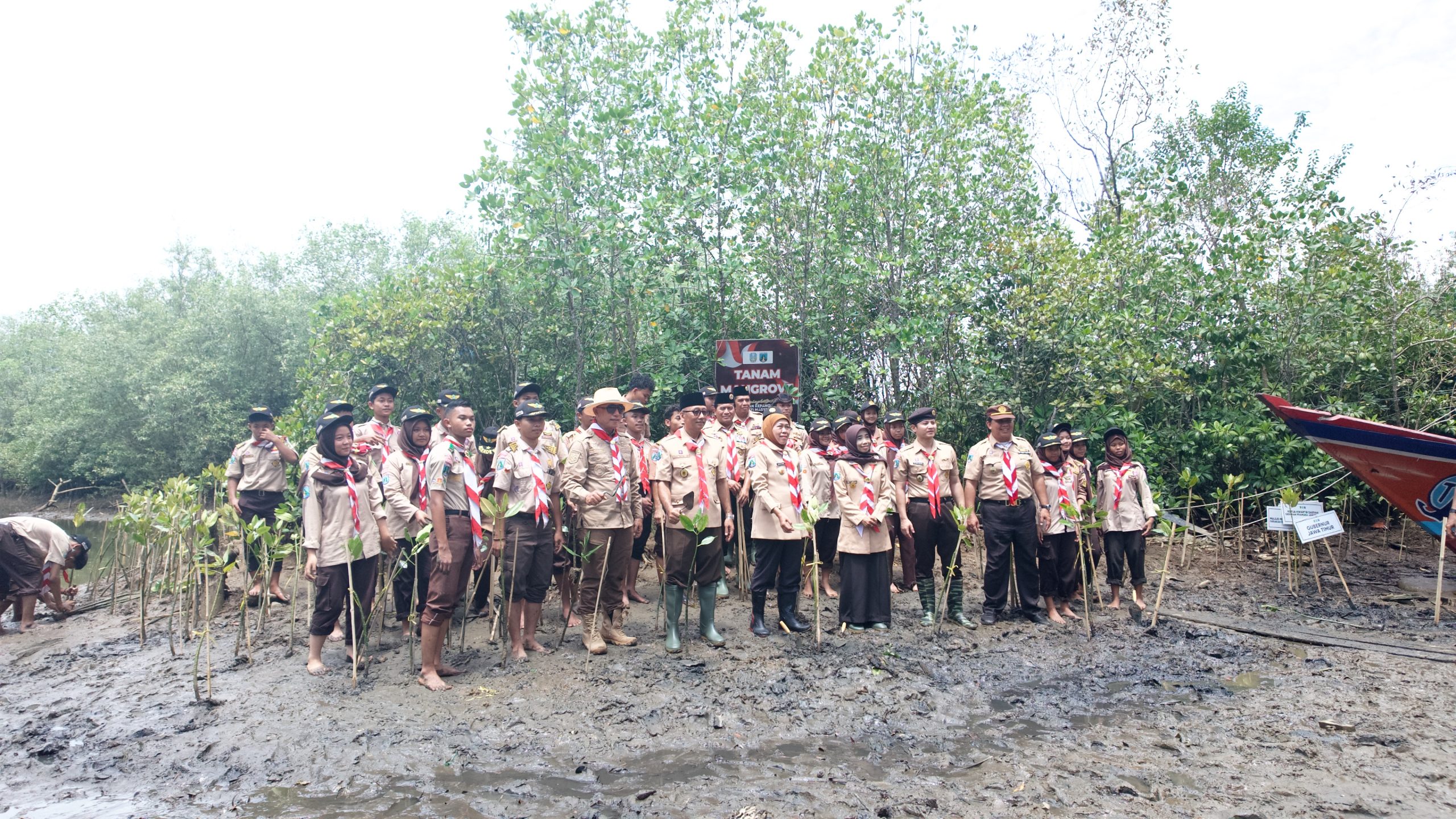Kak Khofifah juga memimpin aksi penanaman ratusan mangrove bersama Kak Siti Mukiyarti dan Kak Suli Daim dari Komisi E DPRD Provinsi Jatim, Ketua Kwarda Jatim Kak H.M. Arum Sabil dan Bupati Trenggalek Kak M. Nur Arifin. Kak Khofifah menekankan bahwa pelestarian lingkungan harus menjadi gerakan kolektif yang berkelanjutan untuk mendukung target nasional menuju net zero emission.